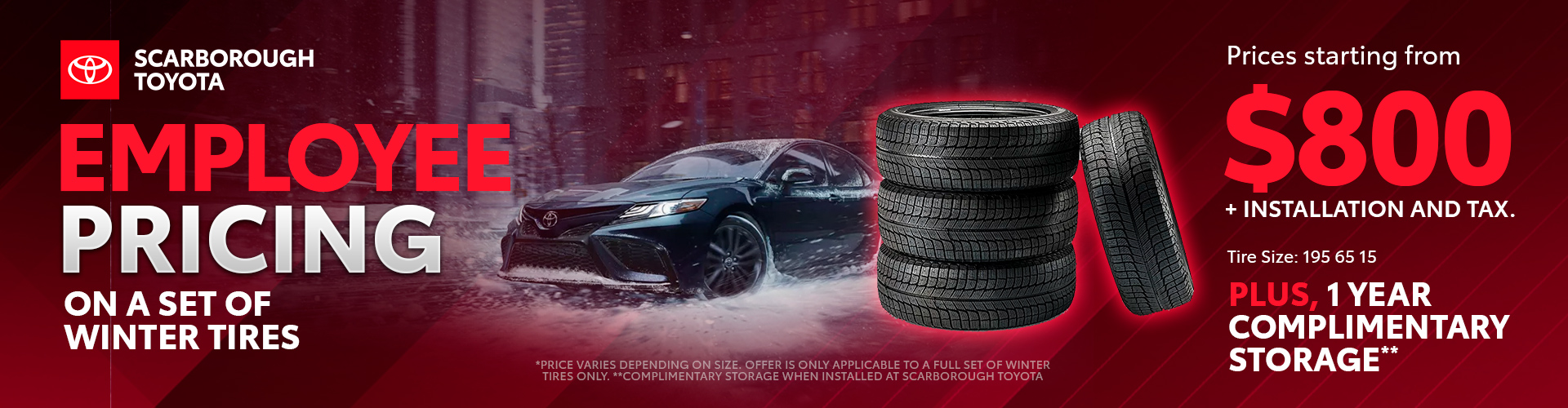 Employee pricing on a set of winter tires! Pricing starting from: $800 + Tax Price varies depending on size. Advertised pricing is for Tire Size: 195 65 15. Applicable to a full set of winter tires only. Complimentary storage when installed at Scarborough Toyota.